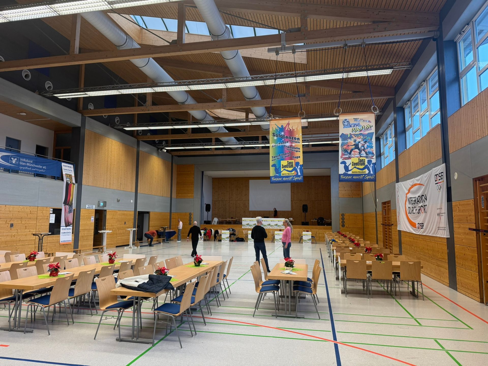 Tanzen, genießen, kommunizieren und ganz viel Spaß beim Tanzsportverein. Schon seit 38 Jahren treffen sich immer zum Jahresende Mitglieder des TanzSportVereins Ramstein in der Kiefernkopfhalle Miesenbach und bringen außer Tanzschuhen auch Gläser, Teller, Besteck und etwas Kulinarisches zum Genießen mit. Schon kurz nach Mittag am 7. Dezember verwandelte sich die Halle. Am Eingang wird ein elegant geschmückter Weihnachtsbaum, von echten Weihnachtssternen umrahmt, die Abendgäste begrüßen. Darunter sind für alle Mitglieder kleine Geschenke ausgelegt. Auch die vielen Tischquadrate vor der Bühne werden toll dekoriert. Für jeweils 10 Mitglieder-Gedecke reicht darauf der Platz rund um zwei glitzernde Weihnachtssterne mit von Karlheinz Wundsam gebundenen Tannengestecken dazwischen. Bunte Kugeln spiegeln sich dann im Kerzenlicht. Auf elf Tischen zwischen Eingang und Theke präsentiert sich abends das kalt-warmen Buffet von Vorspeisen bis Torten. Der Vorstand fasst sich bei der Begrüßung besonders kurz, denn alle möchten nicht lange auf den Genuss der mitgebrachten Speisen warten und anschließend auch noch ausgiebig tanzen. Eng wird es auf der Tanzfläche, als Stefanie zum LineDance-Training einlädt. Schnell wechseln die Rhythmen und auch wenn's nicht immer gleich klappt, beim Wiederholen stimmt die Richtung. Beim Standard- und Lateintanzen helfen sich Paare untereinander, schauen, wie andere die Figuren umsetzen und probieren neue Folgen. Viele Jahreserlebnisse machen die Runde und Zukunftspläne reifen an den Tischen. Ganz ohne Offizielles geht’s auch an diesem Jahresabschluss-Training nicht. Lothar Röhricht dankte seinen Präsidialkolleginnen und Ausschussmitgliedern für die immer mehr werdende, tolle Zusammenarbeit, denn der Verein zählt mit über 300 Mitgliedern jetzt zu den großen im Verband. Enorm gewachsen sind die Kinder-/Jugendgruppen; aber auch bei denen, die als Freizeitsport Tanzen wöchentlich trainieren oder lernen möchten, ist der Zuspruch ungebrochen. Besonders erfolgreich sind die vielen Turnierpaare: Corinna und Stephan Heidenreich eilen von Turniersieg zu Turniersieg und stehen ganz kurz vor ihrem Aufstieg in die A-Klasse. In ihren höchsten, den internationalen S-Klassen repräsentieren die Paare Saar, Wundsam, Bacher/Czempinski und ganz neu dazugekommen auch Axel und Susanne Brauner den Ramsteiner Tanzsportverein. Bei Turnieren starten, und das ist allseits bekannt, auch viele Mitglieds-Turnierpaaren die in der Ramsteiner OBP-Gruppe dabei sind, aber für andere Clubs starten: Kribelbauer-Duhl, Mertz, Seibert, Dietz/Herbrand, Schulz, Theisinger, Müller und ganz neu als Mitglieder Kerstin Schmitt und Thorsten Funk. Dass fast alle Leistungspaare anwesend sind, beweist, wie wohl sie sich bei uns fühlen, denn im TanzZentrum mit dem Schwerpunkt auf Freizeit-Breitensporttanzen ist das Gesamtmotto „Tanzen macht Spaß“!